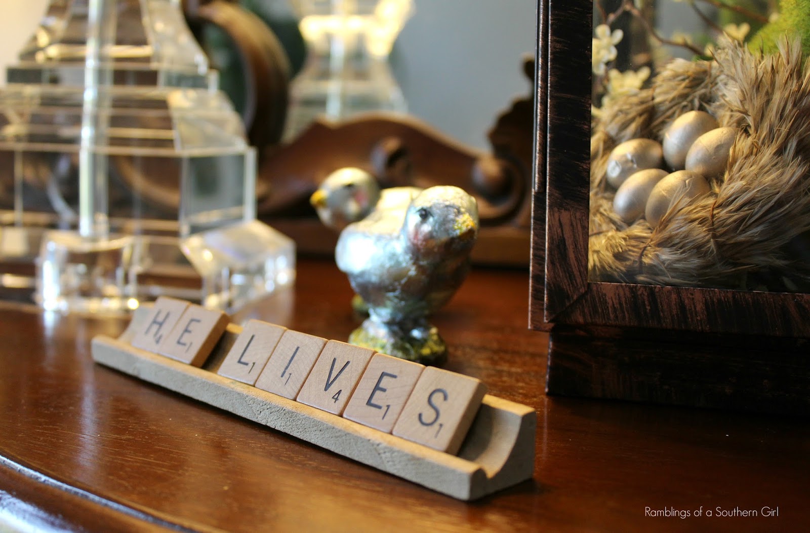 ReplyDeleteWhat a darling vignette! I adore your foil rabbit and indeed He Lives!